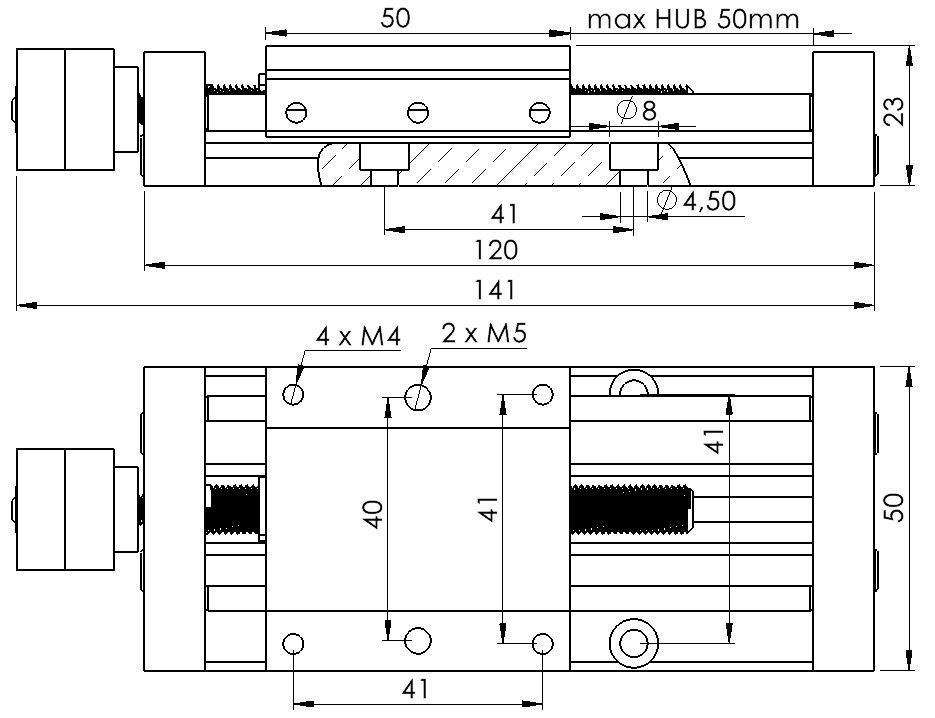 Spindel: M8 x 1 Feingewinde (1 Umdrehung = 1 mm Hub)